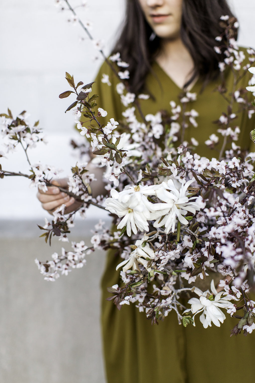 A simple arrangement of blossoming magnolia and plum branches in a mossy clay bowl. Featuring one of my favorite Spring palettes of white, muddy plum, slate and lichen.